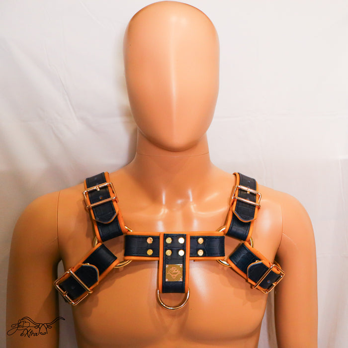 This fashion harness drapes over the shoulders and across the chest in a striking bulldog style, merging elegance with erotic appeal. The alligator embossing adds a stunning visual dimension that is sure to turn heads. 💙