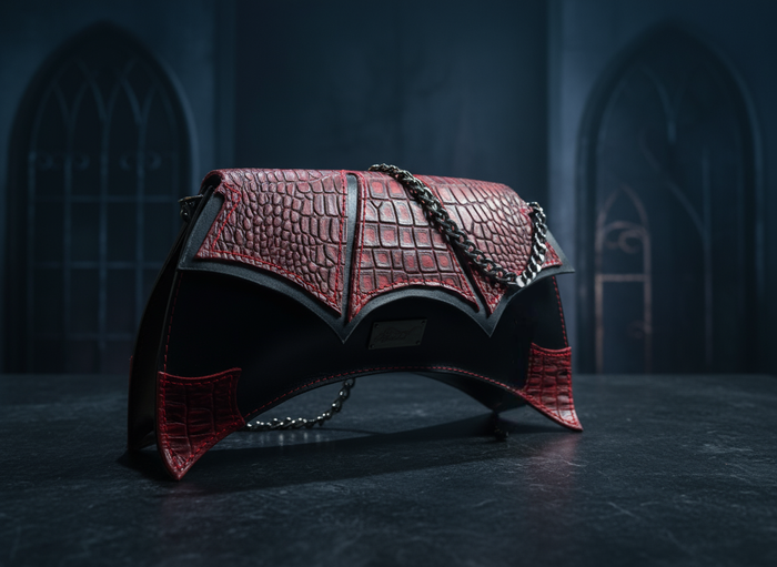 With its contrasting textures of smooth leather and reptile embossing, this Winged Handbag embodies mystery and modern luxury — a perfect balance of gothic charm and refined design.