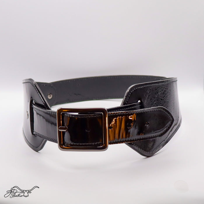 Its unique modern design, hand crafted, patent leather corset belt is sure to turn heads and is the perfect addition to your wardrobe.