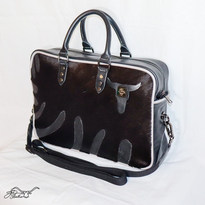 Crafted from genuine hair-on-hide leather paired with full grain vegetable-tanned leather, this spacious Executive briefcase balances durability with timeless style. Measuring 15" wide, 10" tall, and 4" deep, it’s built to carry your essentials while keeping a sleek profile.