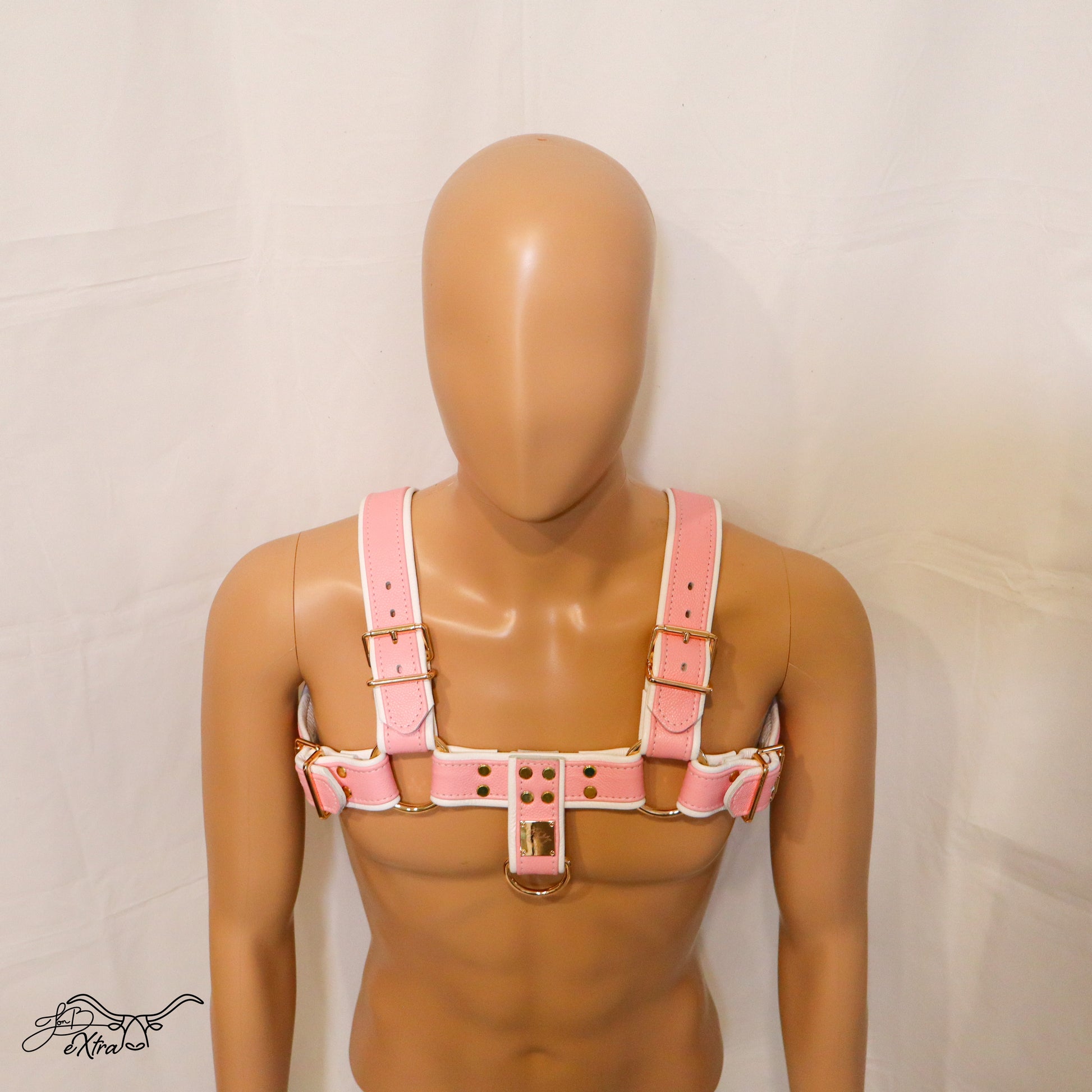 The Pink and White Fashion Harness by Jon B Leather is a masterpiece of style and sensuality, crafted to perfection with full grain leather straps that captivate and excite.