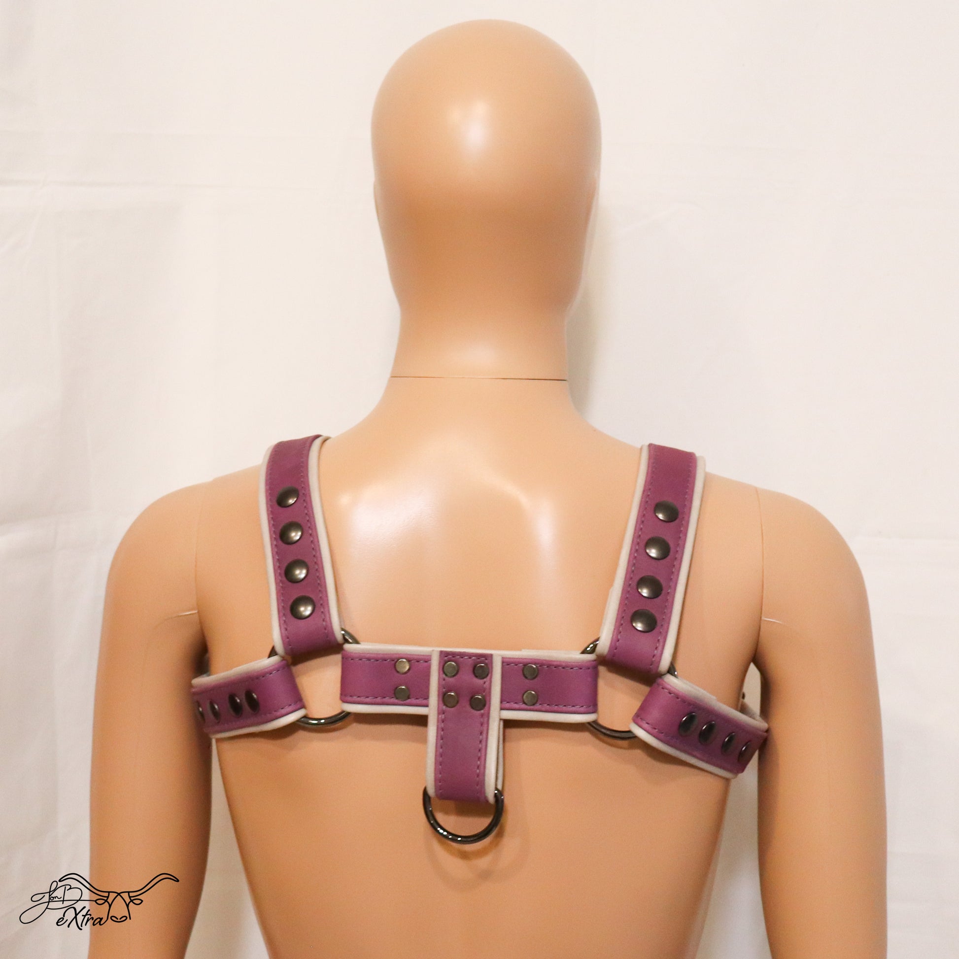 The Purple and Gray Fashion Harness by Jon B Leather is a masterpiece of style and sensuality, crafted to perfection with full grain leather straps that captivate and excite.