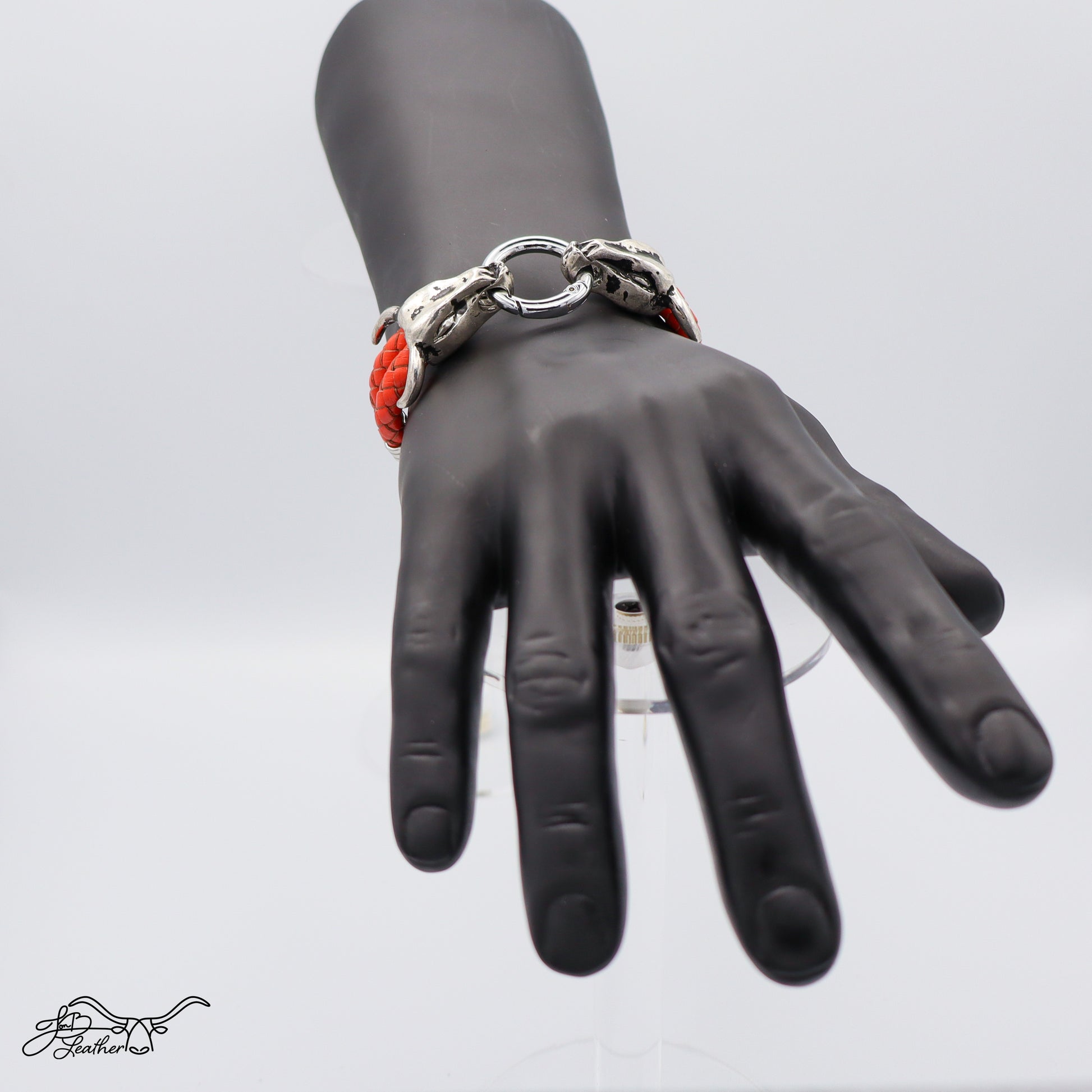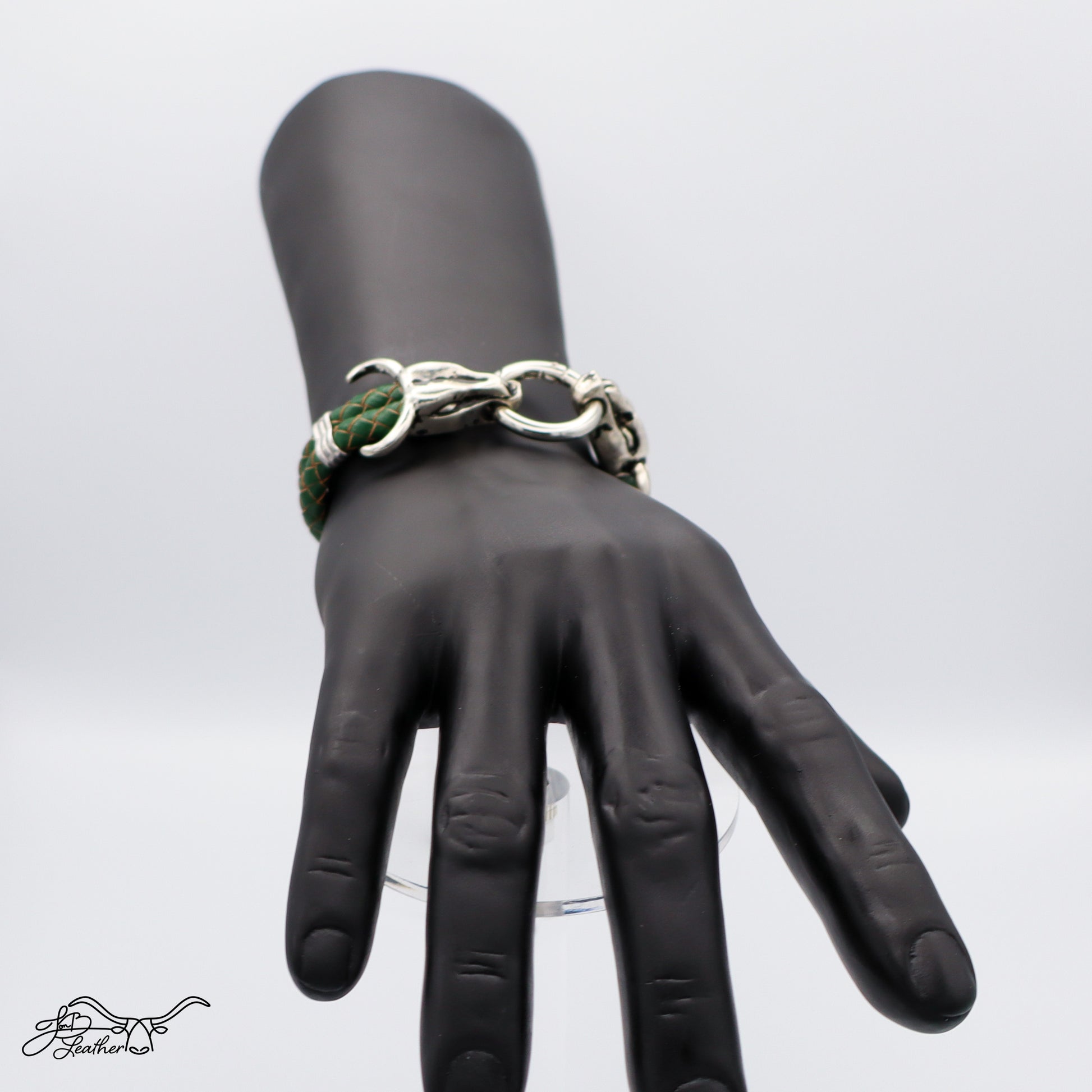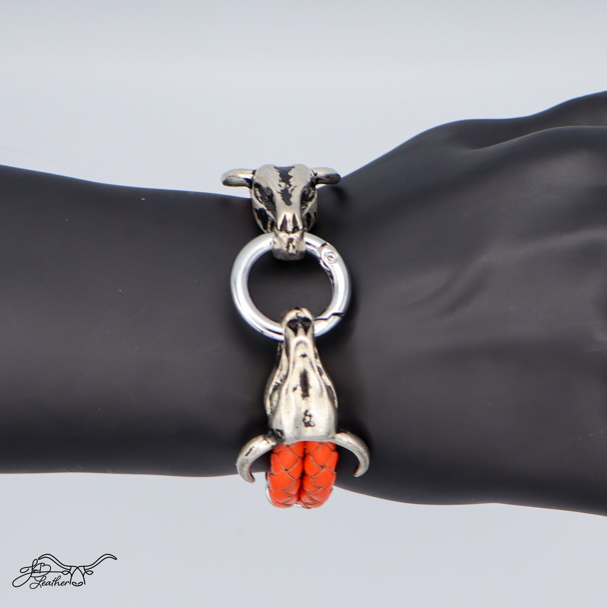 The Longhorn Bracelet: a statement piece for the modern man. This handcrafted bracelet features richly braided leather, accented by two meticulously detailed silver-toned longhorn skull heads. The skulls are artfully joined by a small, coordinating silver ring, creating a striking and memorable design. ðŸ¤
