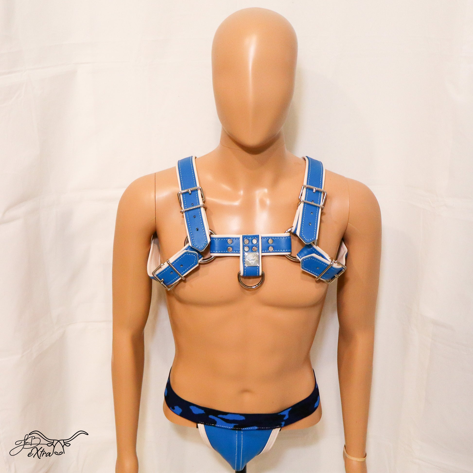This fashion harness drapes over the shoulders and across the chest in a striking bulldog style, merging elegance with erotic appeal. The contrast color stitching adds a stunning visual dimension that is sure to turn heads. 💙